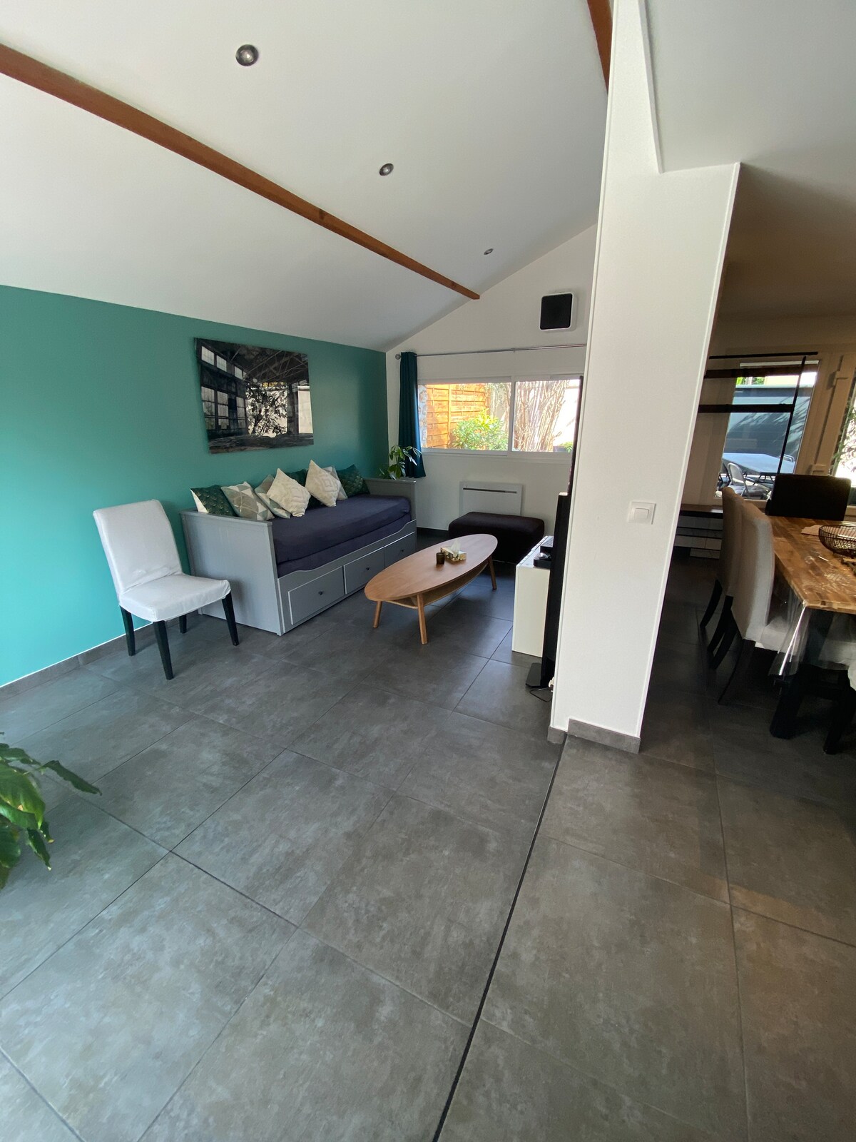 Al fondo de nuestro jardín, alojamiento independiente con terrazas (una en la parte delantera, una en la parte trasera del alojamiento) y acceso al jardín . Una cocina totalmente equipada (nevera-congelador, microondas), una sala de estar con sofá cama convertible rápido para dormir, baño con ducha a ras de suelo e inodoro. Cada espacio está separado por una puerta corredera para respetar la tranquilidad de cada uno de los ocupantes. Relájese en este alojamiento tranquilo y elegante.