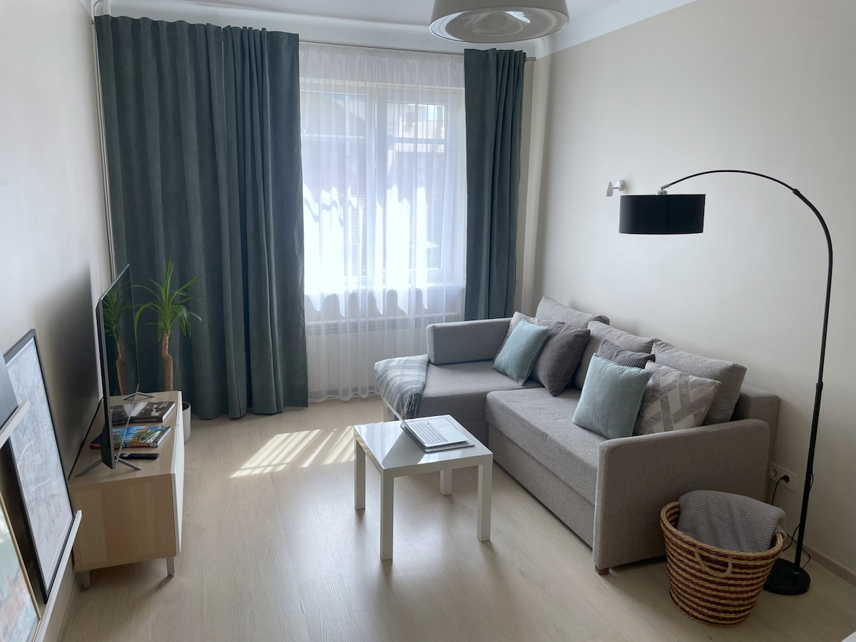 Un moderno departamento de una habitación de 70 m2 con todas las comodidades a pocos pasos del casco antiguo de Vilna. Amplia sala de estar con cocina abierta totalmente equipada, baño con ducha y bañera grande, dormitorio con persianas de madera para la oscuridad, sistema de sonido para noches románticas con vino.