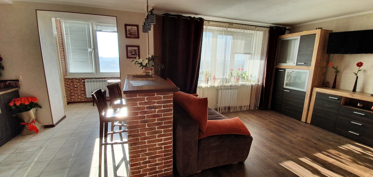 Un exquisito apartamento en el corazón de la ciudad es ideal para relajarse para dos, tres, con un niño y para vivir en viajes de trabajo. *Cómoda cama tamaño queen * sofá doble *Todo lo que necesitas para electrodomésticos de confort (TV, nevera, plancha, microondas, estufa, hervidor eléctrico, lavadora, secador de pelo) *Internet *A pocos minutos de la plaza central de la ciudad, sitios históricos, centro comercial, restaurantes, supermercados, transporte. La fuente está a 5 minutos. * Patio tranquilo, estacionamiento.
