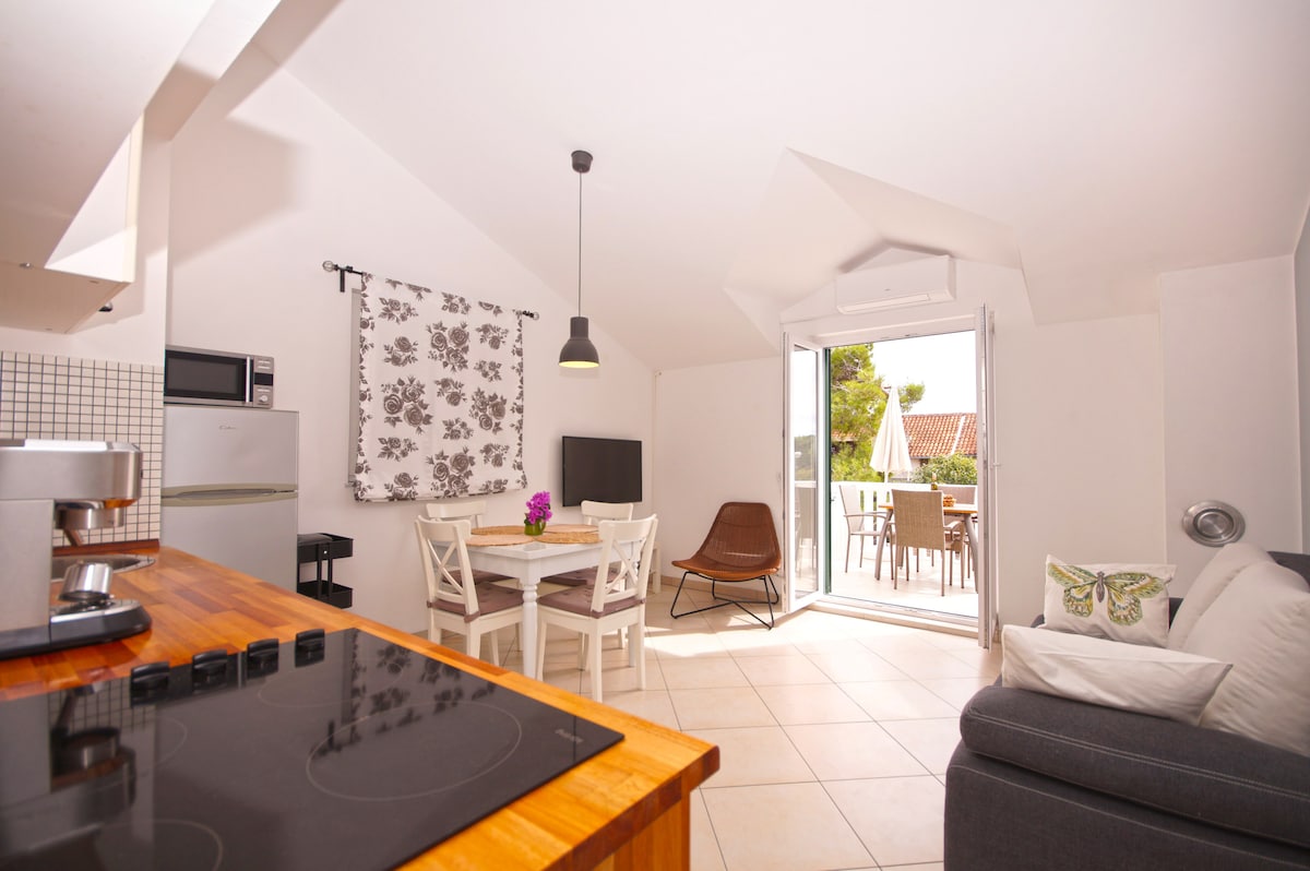 Acogedor apartamento cerca del centro de la ciudad (a 5 minutos a pie) y de la playa de la ciudad (a 10 minutos a pie). La estación principal de autobuses está a 5 minutos a pie del apartamento. Cuando sales de la puerta trasera del apartamento, sales a una pequeña terraza que conduce a un jardín tranquilo. El estacionamiento frente a la casa es gratuito. El uso de aire acondicionado es gratuito. Junto al apartamento Lu tenemos el apartamento Lea que se encuentra justo al lado. En caso de que un apartamento esté ocupado, podría ser posible reservar el otro.