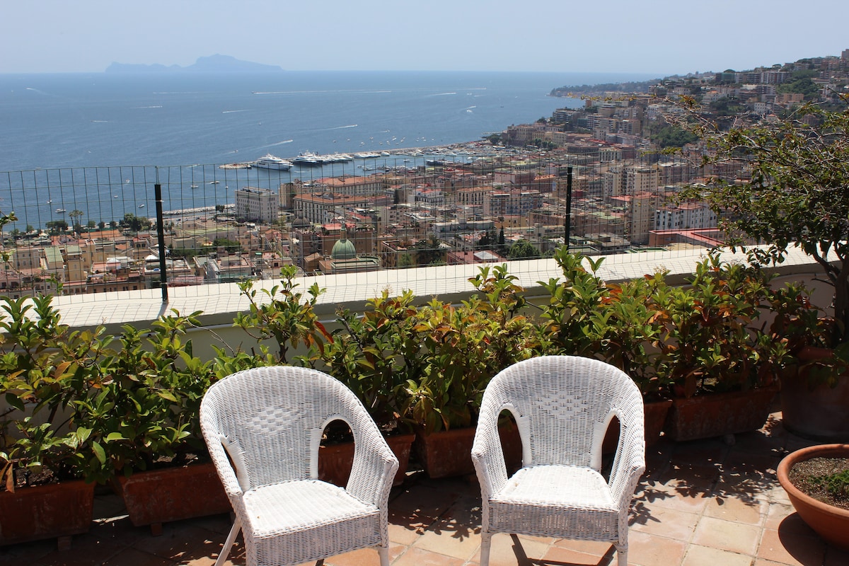 Ático en el distrito de Chiaia,mansión de los años 40 con ascensor de madera.Parking gratuito no asignado.La cumana se puede llegar a pie en Corso Vittorio Emanuele y el metro en Piazza Amedeo.El panorama le hará enamorarse de la vista es sobre todo el golfo:Vesubio,Sorrento,Capri,Mergellina,Posillipo.Theapartment es tranquilo,muy luminoso, goza de todas las comodidades:internet,TV,aire acondicionado,terraza amueblada con mesa,barbacoa,mecedora, rincón fitness con alfombra profesional.