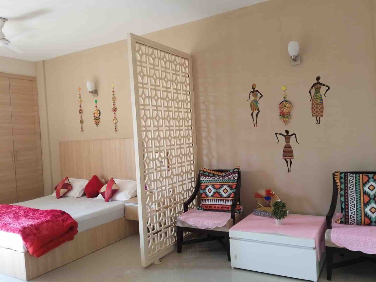 Amplio estudio apartamento bien diseñado, con cocina americana, baño y balcón con sociedad cerrada, piscina y zonas de juego para niños. Tiene sofá cama, aire acondicionado, nevera, comedor y tetera. El apartamento se encuentra a 2,25 km de Bihari ji Mandir y a 1 km de Prem Mandir. Están especialmente diseñados para familias y personas mayores para que puedan venir a Vrindavan y disfrutar. Reglas:- Tendremos que recoger una copia de la prueba de identificación del huésped, no se permiten fiestas. No se permiten parejas solteras.
