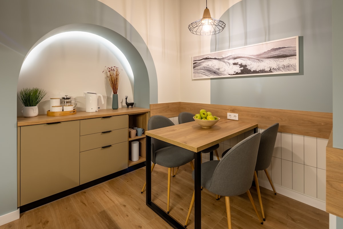 Ubicado en el CORAZÓN de Leópolis, te damos la bienvenida a nuestro elegante apartamento. ¡A pocos pasos de la plaza principal y de la ópera! El entrepiso con suelo de cristal, la bañera directamente en el dormitorio con pared de cristal y la sauna son ideales para un momento único y romántico. ¡El restaurante, el bar y la cafetería están a menos de 1 minuto a pie!