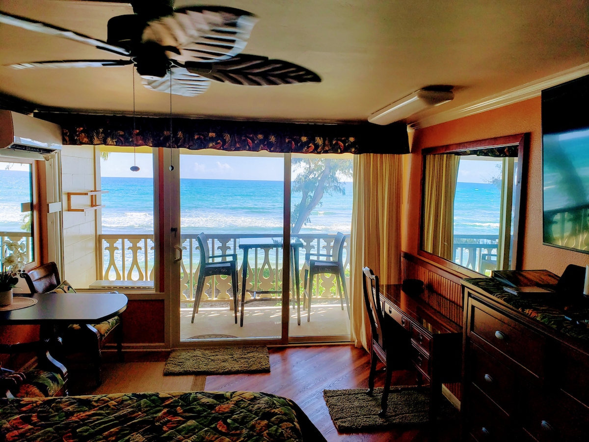¡Descuento de Kamaaina ofrecido! Apartamento con vistas al mar en un complejo hotelero, cerca de la ciudad de Kapaa. 3 adultos como máximo en el espacio. Vistas al mar, la piscina y el jardín. A pocos pasos de la playa y la piscina. Hermosa decoración hawaiana. The Islander on the beach es un pintoresco apartamento/hotel frente a la playa en 6 acres prístinos de paraíso tropical. Estudio en planta baja con dos camas tamaño queen y baño privado. Hermoso aire acondicionado. Gran wifi/televisión por cable. Doble limpieza entre huéspedes.