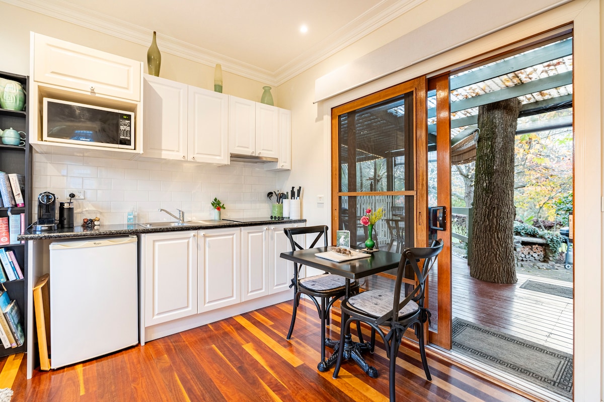 Este espacio privado y acogedor es una casa de huéspedes independiente recién reformada en el corazón de Monbulk. A solo unos minutos a pie de las tiendas de la ciudad, tienes de todo, desde cafeterías y restaurantes hasta Aldi o Woolworths. El espacio es perfecto para una o dos personas y está cerca del transporte público y de los lugares de celebración de bodas locales en la zona. Se proporcionan suministros para el desayuno como granola, leche, yogures, mantequilla, pan, té y café. Siéntete como en casa y relájate en este acogedor espacio.