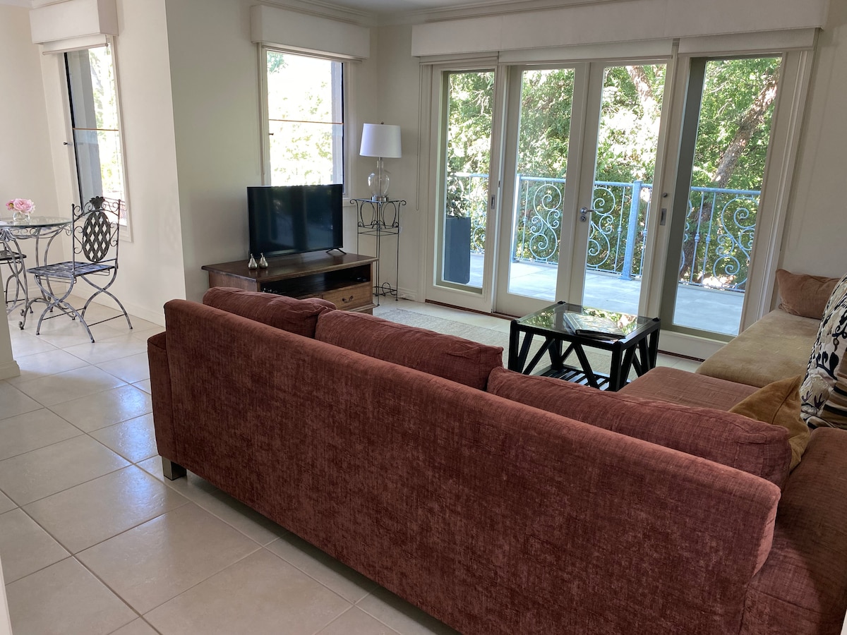 Via Bella Vista is an elegant, light filled , self contained, upstairs apartment with its own entrance. Surrounded by beautiful trees. It has two bedrooms one Q/B with French doors opening onto the balcony and K/B overlooking the garden.