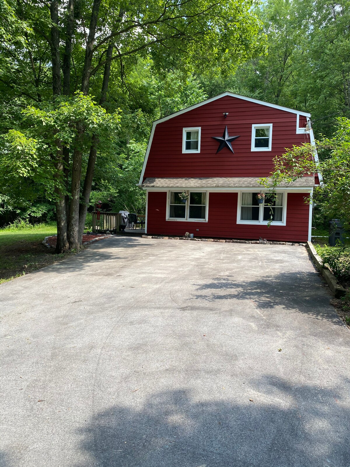 Quiet property,almost 8 acres, of beautiful wooded property . Set back from the road. Many trails, wineries and breweries nearby. Legoland is 20 minutes away and many antique shops within 30 minutes or so. We live in the other house on the property, so we are accessible. You can take a stroll on the path by the stream or sit on the spacious 35 x 10 foot deck and enjoy the natural setting of the property. Fire pit is now available. Enjoy the night air and gaze at the stars.