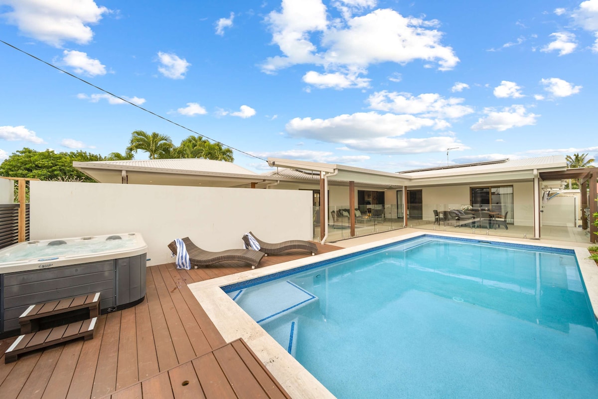 Escápate a tu propio escondite costero a menos de 200 m del surf, las cafeterías y la cervecería de Moffat Beach. • Perfecta para familias o amigos • Dos casas de campo = espacio para separarse pero aún así conectarse • Piscina de magnesio con burbujas de spa y un asiento incorporado. • Espacios privados para reunirse o retirarse cuando sea necesario. • Iluminación de festones, tumbonas y alrededores tropicales. • Ambiente limpio y playero, arte original y espacios bien configurados. • Wifi rápido y 2 espacios para autos. Desconecta, relájate y acomódate al ritmo fácil de la vida en la playa.