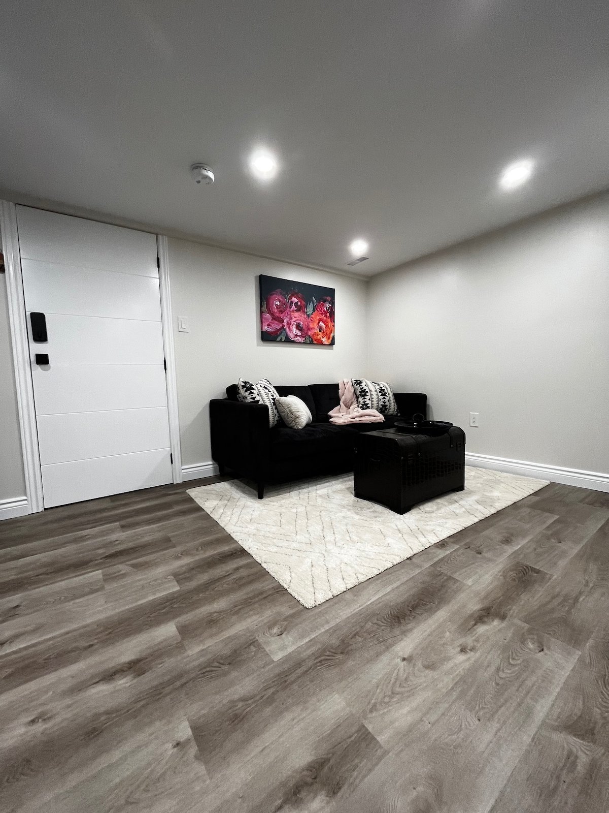 Te sentirás como en casa en esta gran y luminosa suite con entrada privada, cocina completa con todas las comodidades, comedor con capacidad para 6 personas, 2 dormitorios con camas acogedoras, cama tamaño queen extraíble La-Z-Boy en la sala de estar y cuna plegable que puede caber en muchos lugares. Bonus: ¡espacio de trabajo con ventana y vestidor/trastero de 7'x5'! Espacio para 2 coches de invitados en la entrada, a unos pasos del transporte público y a minutos de las autopistas. Entra mucha luz natural y se puede salir al patio. Relájate y disfruta de Smart TV, Disney+, Crave, libros y DVD.