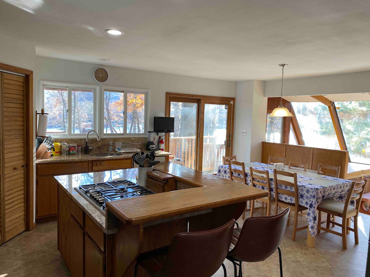 Tranquila casa privada junto al lago situada en 2 acantilados de roca raros que te ofrecen una majestuosa vista al agua tal y como era en 1939. Habitación extra grande con una gran chimenea. La gran cocina rodea al chef. Gran jacuzzi, bote de remos con dosel, 8 kayaks, casa del árbol, ventanas infinitas junto al lago, muelles, a 1 hora de Manhattan con águilas y una gran vida silvestre como si estuvieras en el bosque profundo. Lago limpio y virgen lleno de peces. Nunca ha tenido motores de gasolina. Un lago en la cima de una montaña sobre la zona de esquí. ¡Observación de estrellas! Ideal para reuniones.