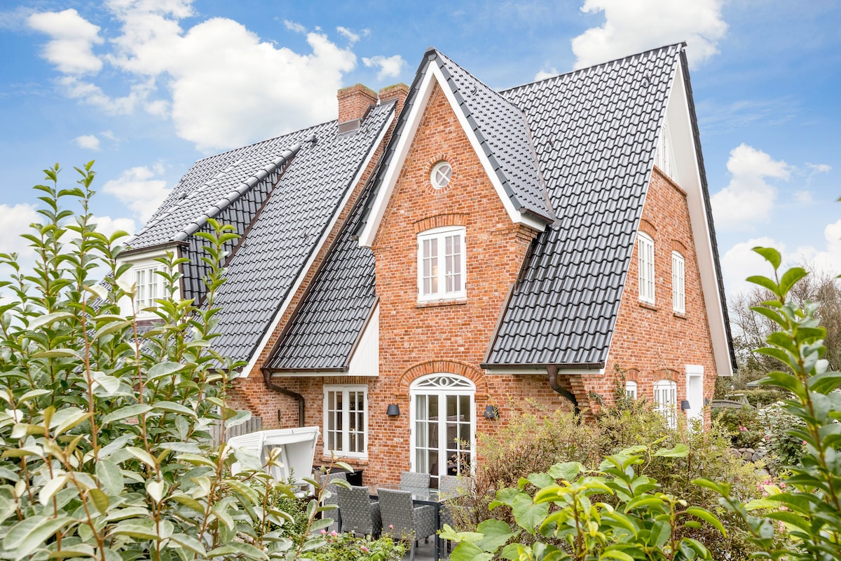 Casa de campo de lujo "Hygge Hüs" (158 m²) ubicada en el centro de Westerland para un máximo de 6 personas. 3 cómodos dormitorios, 2 elegantes baños con ducha, aseo de invitados, sauna privada, amplia sala de estar. Jardín y terraza con muebles de jardín y silla de playa. Wifi, lavadora, secadora, cafetera disponible. 2 espacios de estacionamiento privado. Se admiten perros alergicos. Domicilio para NO fumadores.