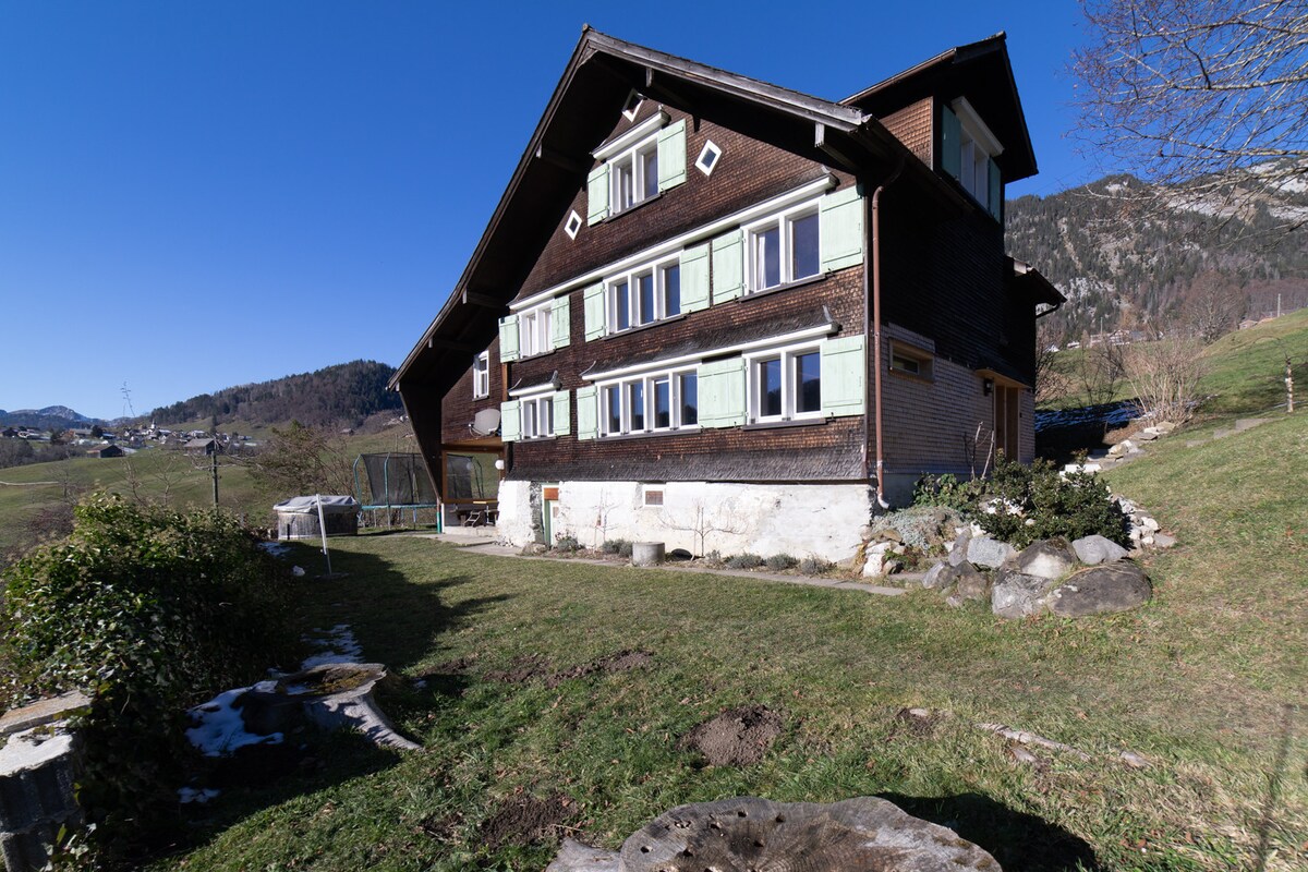 Ubicación tranquila con las mejores vistas, por toda la naturaleza. La casa se encuentra en el Gamserberg a 975 m sobre el nivel del mar adyacente a mi granja. Con hermosas vistas del valle de St. Gallen Rhine y el hermoso paisaje montañoso que te rodea. Planta baja: cocina con estufa de leña para calefacción, amplio salón, terraza y entrada. 1er piso: 2 dormitorios y baño con ducha y lavadora. Segundo piso: 2 dormitorios.