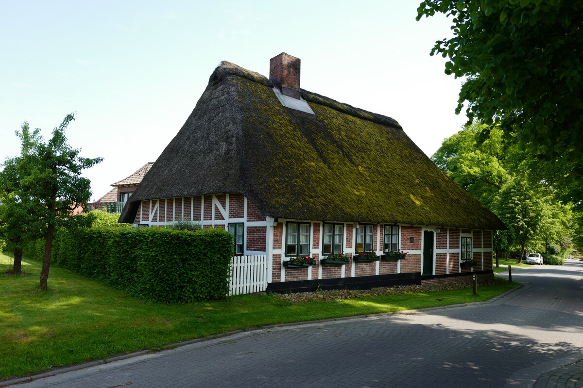 Siéntate y relájate en esta acogedora casa con tejado de paja, elegante y de lujo, en las afueras de Worpswede. La casa de huéspedes se encuentra en una parcela de 7500 metros cuadrados, muy cerca de nuestra casa. Cuenta con 1 dormitorio, oficina, sauna (incluida), baño, cocina, sala de estar, trastero y jardín con terraza. 1 bicicleta de mujer y 1 bicicleta de hombre están disponibles para su uso gratuito.