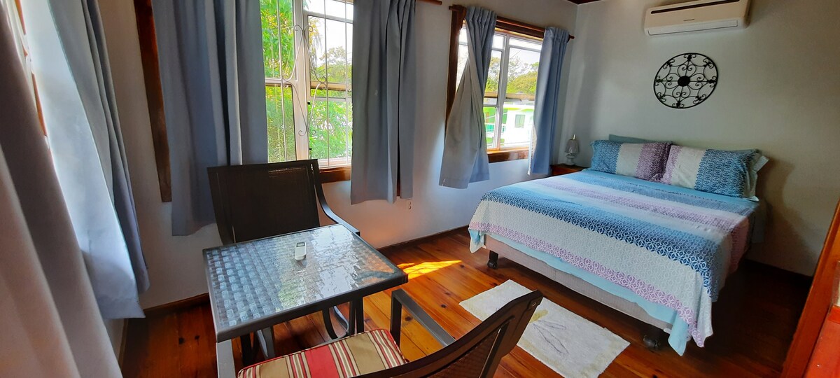Guava Grove Small Hotel. Estudio limpio de cocina pequeña de dormitorio queen con sala de estar con ducha de agua caliente con baño privado. Gran piscina con tumbonas y baños en el área común. Estacionamiento gratuito. Hay aire acondicionado disponible (+$10/noche), Wifi de fibra óptica. Unidad de la planta principal en un edificio de madera. Pequeño balcón con mesa exterior y sillas. Esta unidad final ofrece privacidad sin que nadie pase frente a tu puerta. Piscina en la zona común con tumbonas, sombra y baños.