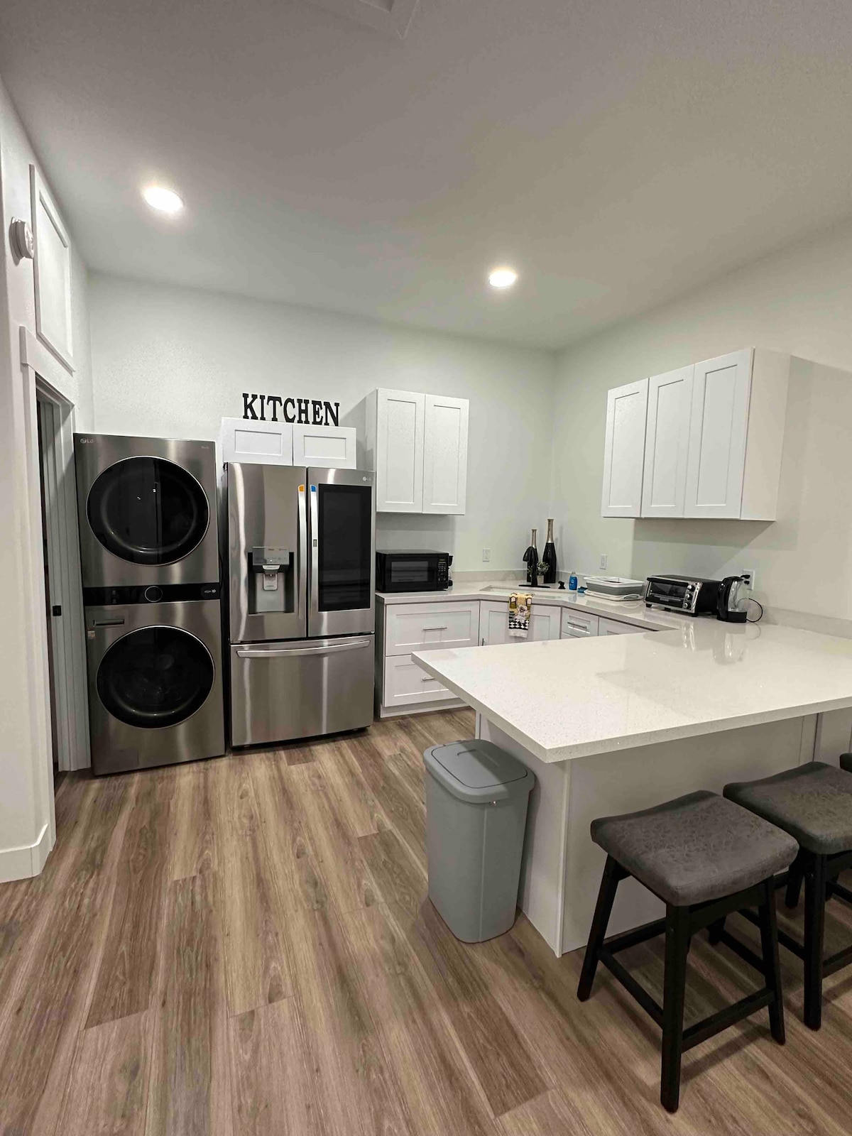 Bungalow de ladrillo de un dormitorio bellamente decorado. Disfruta de la sensación lujosa pero encantadora de la cocina gourmet personalizada con una gran isla, encimeras de cuarzo, combinación de armarios frontales sólidos y de vidrio, electrodomésticos inteligentes de acero inoxidable de primera línea, pregunta a Alexa direcciones, el clima o reproduce música y la pantalla wifi del refrigerador inteligente LG responderá. Baño de azulejos con ducha de vidrio europea, azulejos tipo metro, cabezal de ducha tipo lluvia con presión de agua óptima. Este alojamiento único tiene personalidad propia.