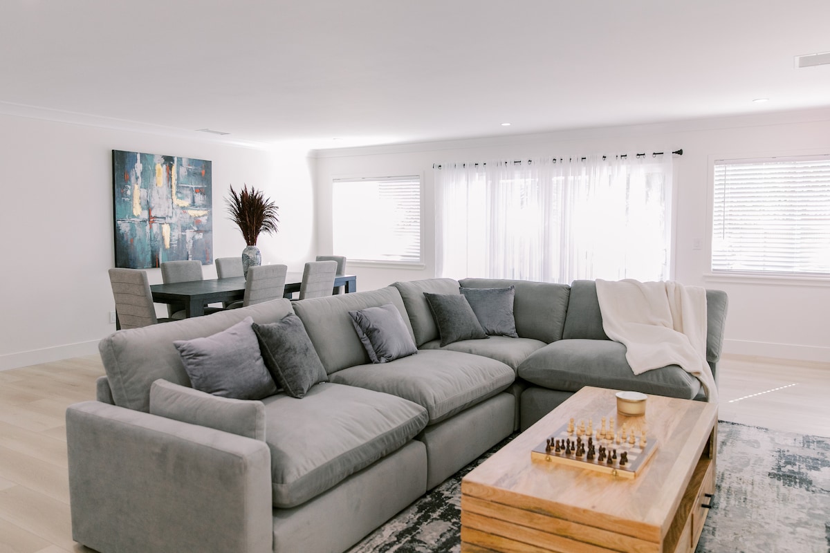 ¡Bienvenido a tu elegante refugio en Long Beach! Disfruta de esta propiedad bellamente diseñada ubicada a menos de una milla de la playa y cerca del centro de Long Beach y Belmont Shore. Ideal para familias, amigos o viajeros de negocios, la casa ofrece comodidad, conveniencia y estilo. 3 dormitorios y 2,5 baños: capacidad para 8 personas con dos camas tamaño king y más. Espacio de oficina dedicado: ideal para trabajar a distancia. Gimnasio de boxeo: totalmente equipado para el fitness. Patio: cómodos asientos al aire libre. Lavandería
