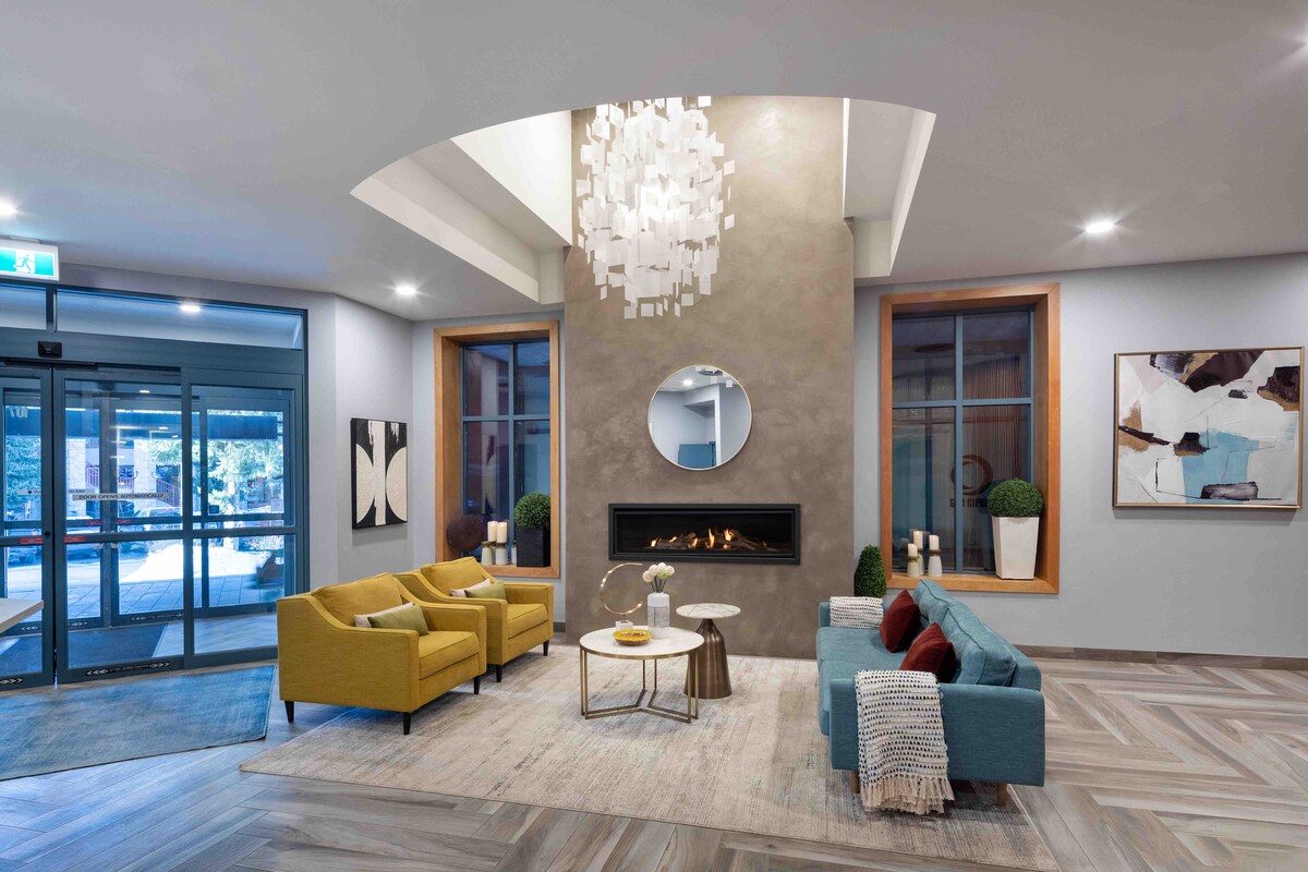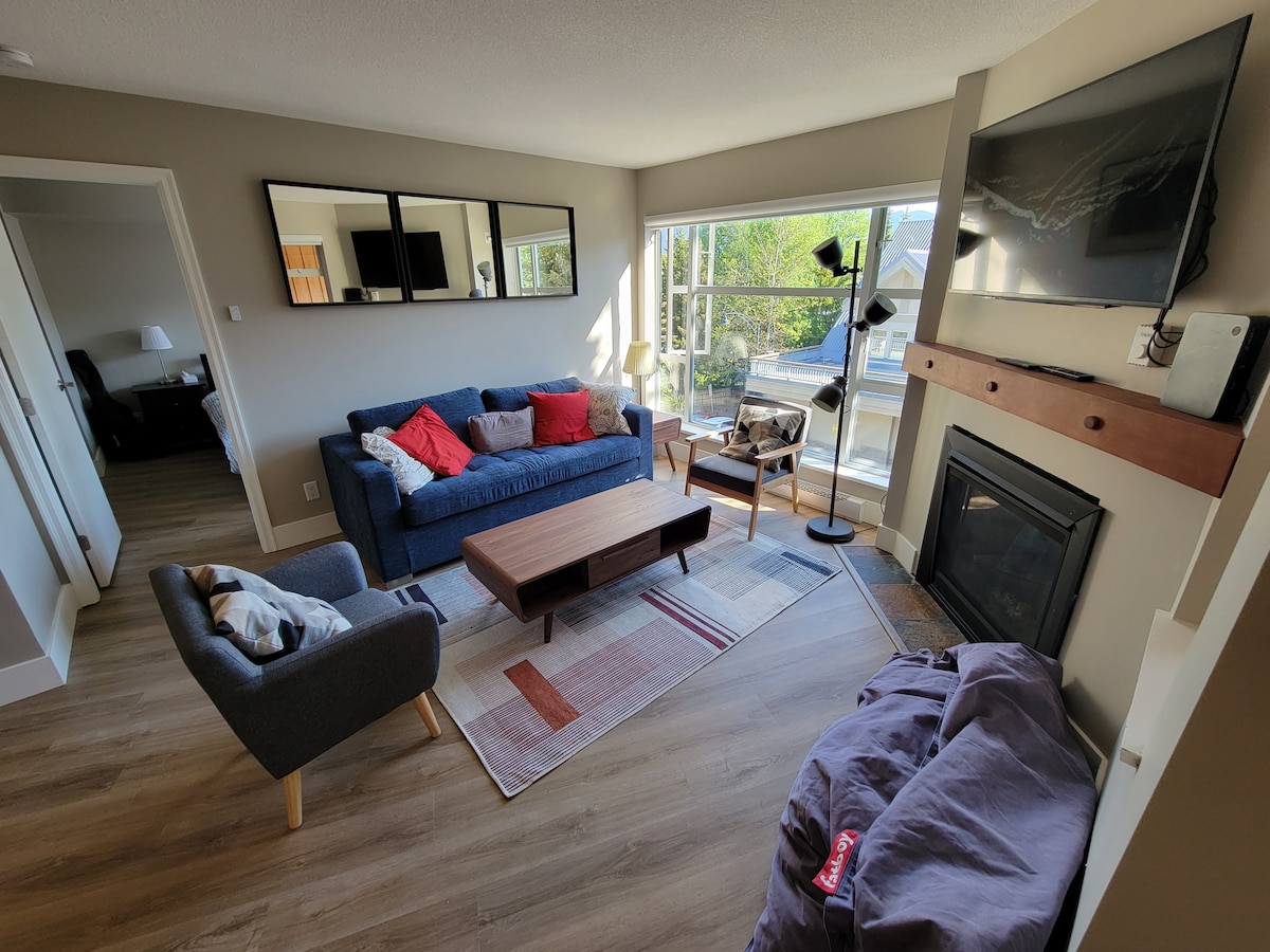 Te damos la bienvenida a tu oasis de montaña. ¡A 1 minuto a pie del ascensor Blackcomb! Nuestro moderno condominio es un dormitorio luminoso y espacioso con ventanas envolventes para unas vistas perfectas a las montañas y a los árboles. ¡Mira hacia arriba la montaña Whistler mientras bebes café desde la mesa de tu cocina! La suite lo tiene todo: - Cama tamaño king Sofá cama. - cocina completamente - bañera de hidromasaje - Keurig. - Parlante Bose - Aire acondicionado central - actualizado en julio de 2025. El edificio tiene un gimnasio, lavandería, piscina y bañera de hidromasaje al aire libre.