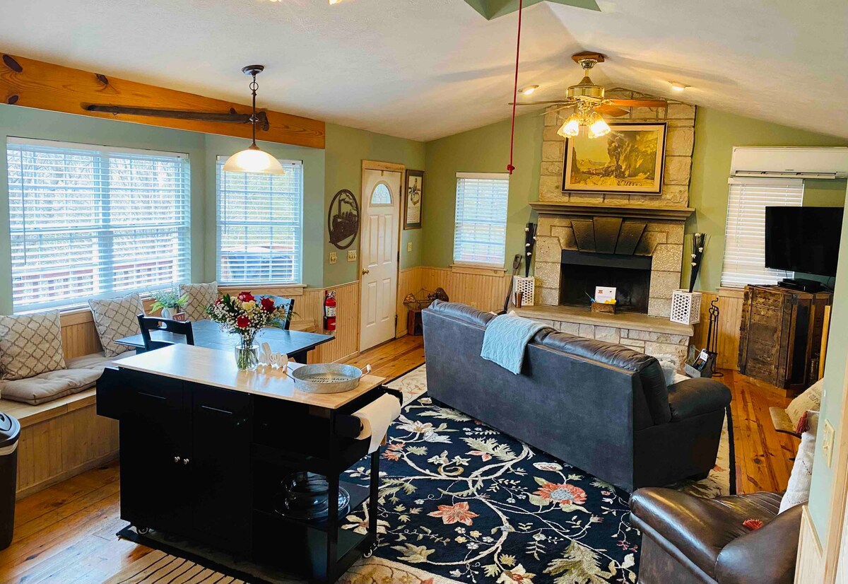 Insta: @the.cbcollection La cabaña en la ladera combina el estilo moderno con el acogedor encanto de Ozark en una ubicación privada pero conveniente de Eureka Springs. Esta cabaña de concepto abierto de 1 dormitorio y 1 baño cuenta con una combinación de bañera/ducha, chimenea de gas, TV Roku, consola de juegos, altavoz Marshall y wifi Starlink de alta velocidad. Disfruta del patio al aire libre con fogata y parrilla de gas, todo a pocos minutos de las tiendas, restaurantes y atracciones del centro de la ciudad.