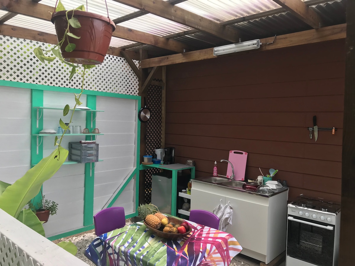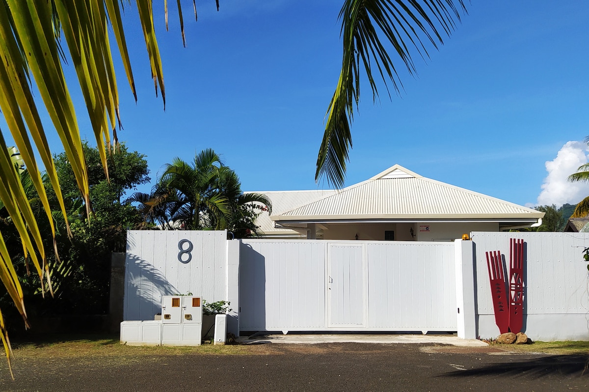 Moorea, salida de la Bahía de Cook, nuestro bungalow para 2 (+BB Ok si está equipado) se encuentra en el terreno de nuestra casa familiar. Romántico y con todas las comodidades (aire acondicionado, cama QSize, cocina, cuarto de baño, inodoro, terraza privada) se enfrenta a la vista de la laguna y a los espacios compartidos: jardín tropical, piscina y espacio para barbacoa. Si lo desea, compartimos buenos planes, trucos, momentos con nuestra familia y nuestros súper perritos con mucho gusto. Opción de spa de burbujas posible en su terraza privada.