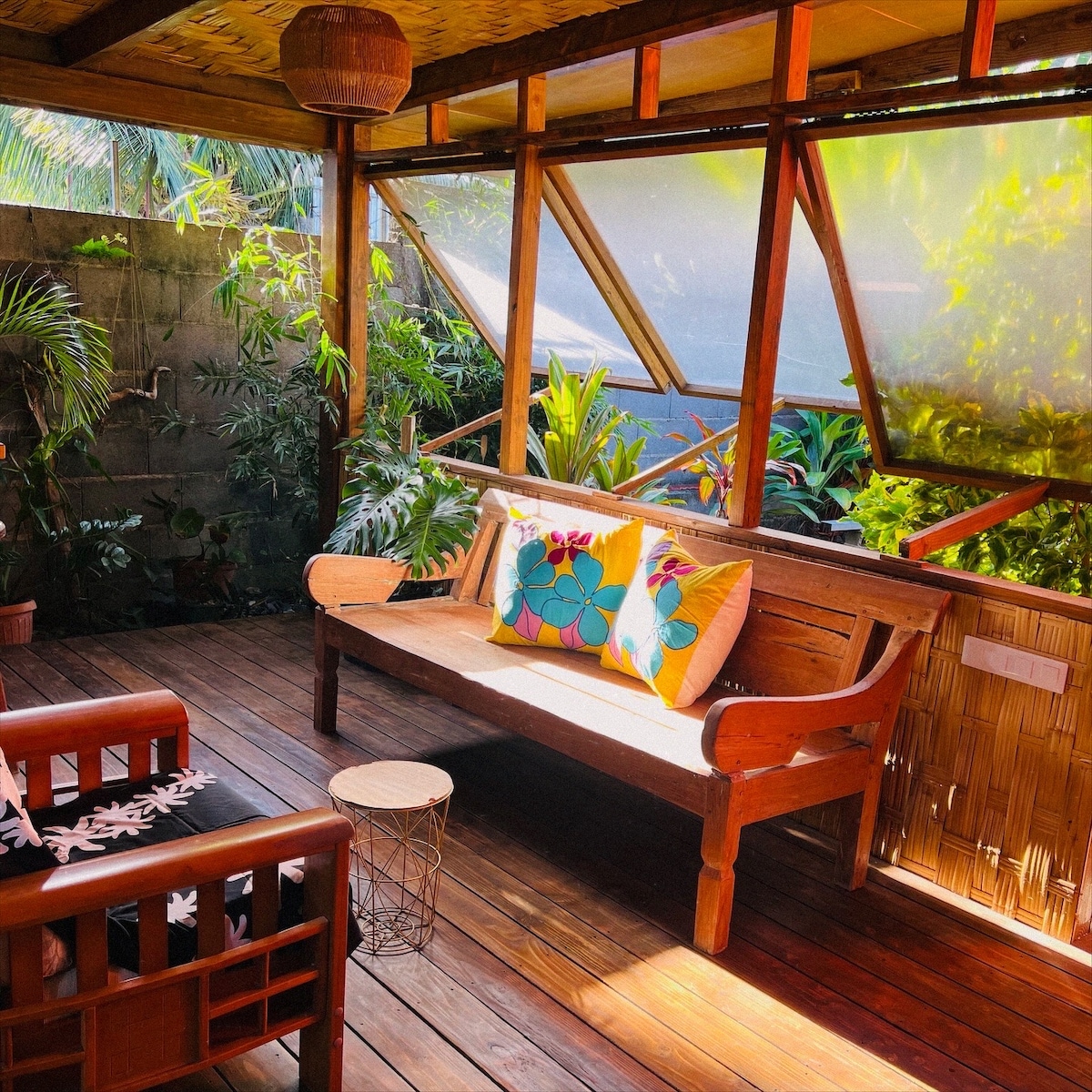 Escápate a un refugio tranquilo en Moorea. Ubicada en el corazón de una zona boscosa con vistas a un cocotero, esta encantadora casa de madera ofrece un entorno idílico para relajarse y recargar energías. El acceso privado a una laguna protegida te permitirá descubrir una vida marina excepcional y admirar majestuosas ballenas saltando a pocos metros del arrecife durante la temporada (julio-noviembre). Relájate en la terraza con un cóctel al atardecer. Vuelve a conectarte con la naturaleza y sumérgete en la cultura polinesia. El lugar perfecto.