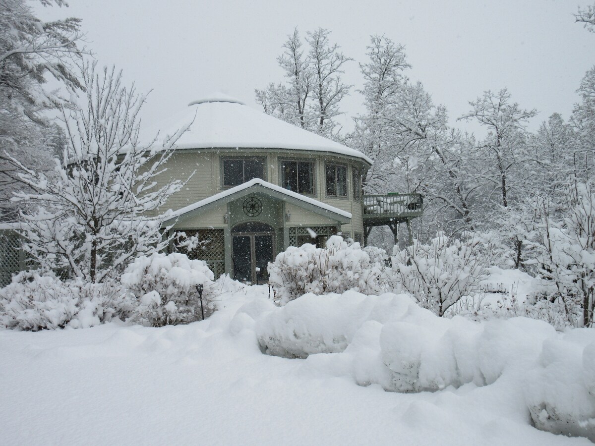Cerca del cielo para artistas y amantes de la naturaleza. El espacio para huéspedes es toda la primera planta de una casa redonda de 47' con ventanas de seis pies que permiten una vista de 180 grados en media milla privada en el río Connecticut. Amplios jardines, porche privado de 30' con vistas a la playa de arena y al vórtice de natación natural. 4 kayaks, chimenea en la orilla del río, hamacas de cuerda en la orilla del río. Estudio con luz del norte, cama tamaño queen y sofá plegable, dividido del dormitorio por cortinas. Pequeña zona de cocina y comedor.