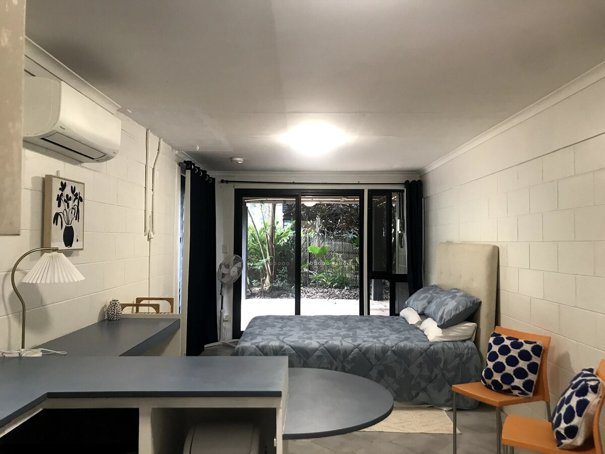 Cabaña privada, totalmente amueblada, ubicada en nuestro patio trasero, un espacio tranquilo y cómodo ideal para viajeros solitarios, parejas o profesionales. Incluye una cómoda cama doble, armario, cajones, estantería, escritorio, mininevera, hervidor y microondas (no cocina completa). Baño privado. Aire acondicionado y WiFi incluidos. Disfruta del patio al aire libre, perfecto para el café de la mañana o para relajarte por la noche. Ubicado a solo 10 minutos del aeropuerto de Darwin y del centro comercial Casuarina, y a 15 minutos del distrito financiero.