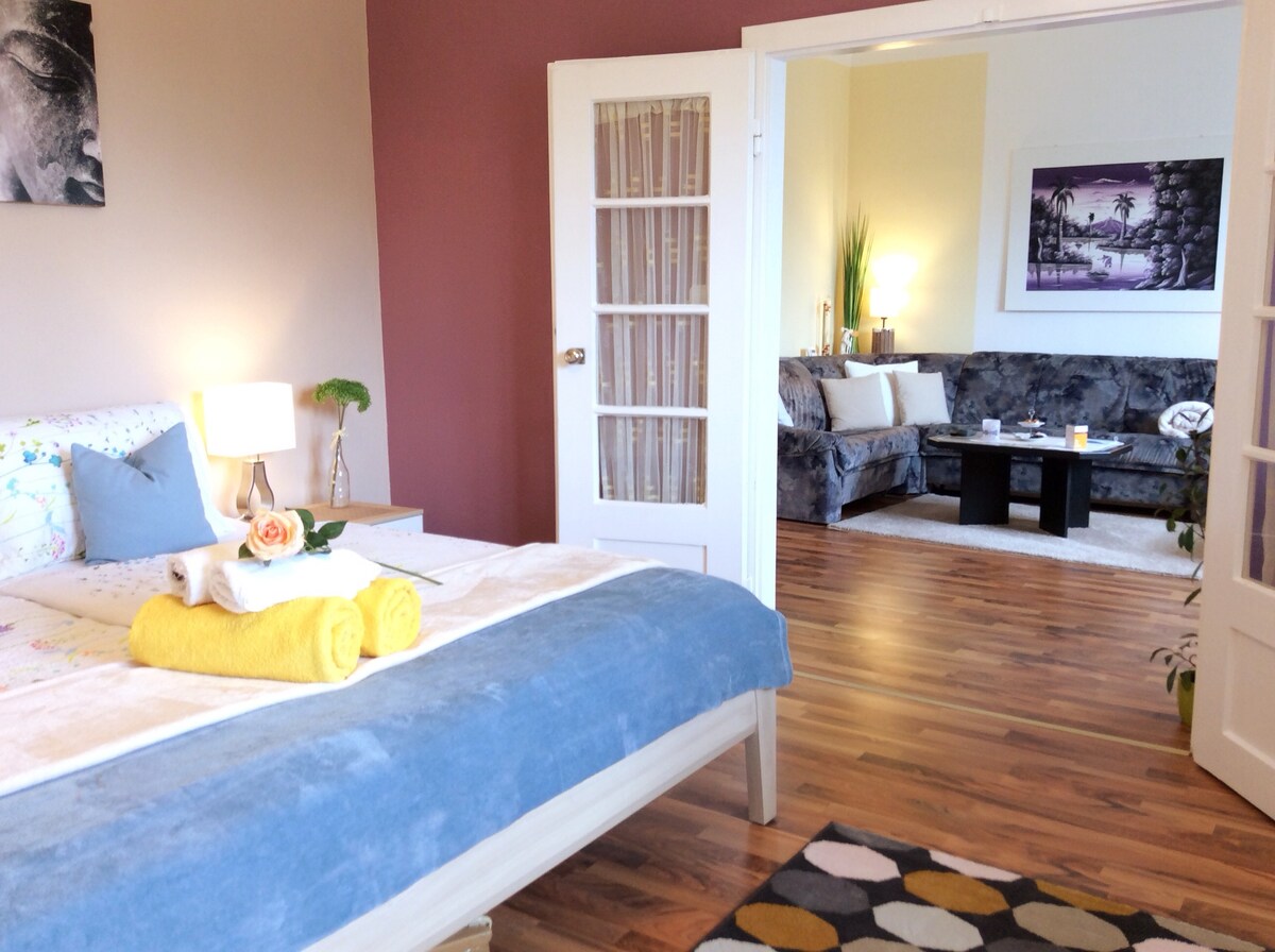 Este hermoso y bien equipado apartamento con estacionamiento gratuito frente a nuestra casa con jardín incl. espacio de estacionamiento cubierto para tus bicicletas ofrece mucho espacio y está en una zona residencial muy segura y tranquila, a solo 10 minutos a pie de la isla del Danubio y también el centro de la ciudad de Viena es rápida y fácilmente accesible. La estación de autobuses se encuentra a pocos pasos de la casa. En coche, puedes llegar a los numerosos lugares de interés vieneses en unos 15-30 minutos.