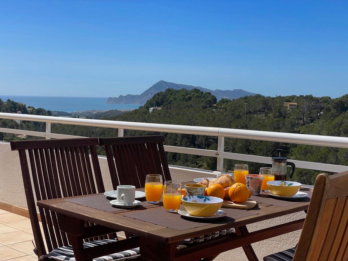 El apartamento se encuentra situado a 200 metros del casco antiguo del pueblo. Es una tercera planta con orientación sureste. Dispone de 1 habitación principal con cama de matrimonio, baño, cocina y salón con sofá cama de apertura italiana. Todo el apartamento dispone de tarima flotante. La joya principal es su terraza, donde podréis disfrutar de maravillosos momentos, con vistas a las montañas de Aitana y Aixortà, y al fondo el pico de Bernia y el mar, Esperamos que os encante.