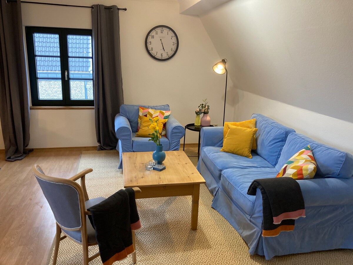 Hola, somos Lena y Marcel, y os invitamos cordialmente a relajaros con toda la familia en este alojamiento. Nuestro apartamento está situado en una zona tranquila y acogedora en las afueras. Disfrute del moderno baño, la ducha a ras de suelo y la luminosa cocina totalmente equipada. El gran salón invita a relajarse en el sofá con Netflix y Xbox. ¡Aquí se llega a través de la puerta de dos hojas al dormitorio, que da luz a la habitación! ¡En la terraza se puede relajar cómodamente junto al fuego! ¡La chimenea es solo decoración!