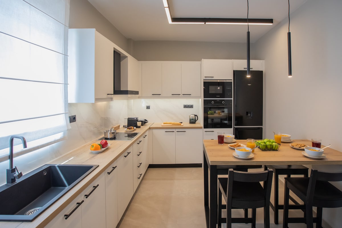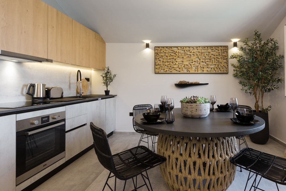 The ground floor house "AQUAMARINE" can host up to 4 guests and an infant. The main feature of this property is the stunning view of the horizon and the sea from every corner of the house. The aesthetic of a beautifully designed house boasts a panoramic sea and coastal view from every room. The living space is comprised of one grand spacious room. The kitchen comes fully equipped with all modern appliances. There are two en suite bedrooms with comfortable king size beds.