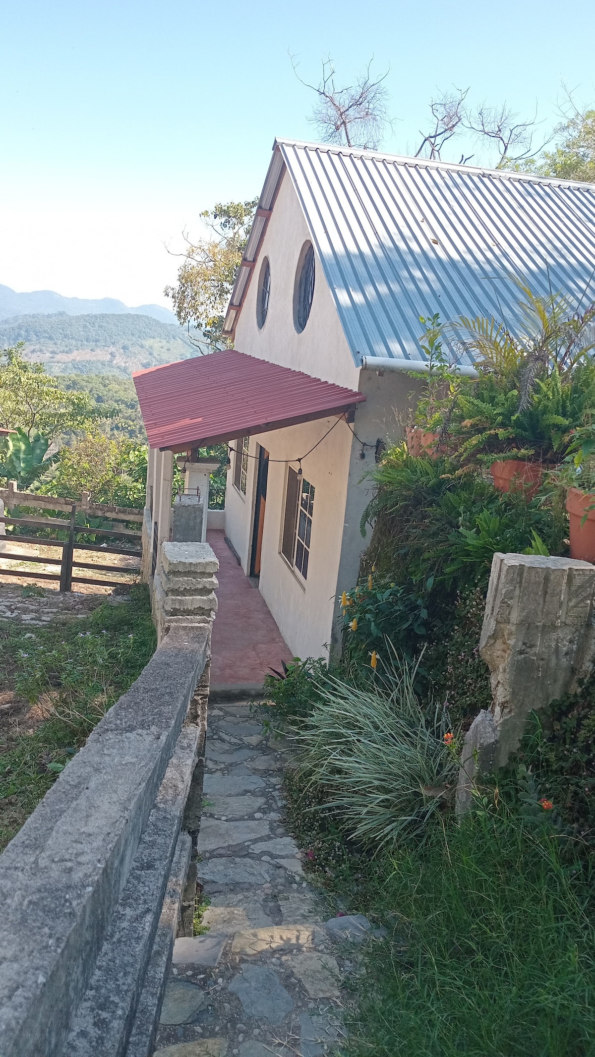 Es una casa de campo tiene dos recamara ,sala con chimenea ,comedor y cocina ,hay un jardín y puedes hacer una caminata en la naturaleza en el jardín hay un asador con un techo de lámina, la casa cuenta con agua caliente y fría ,tv .