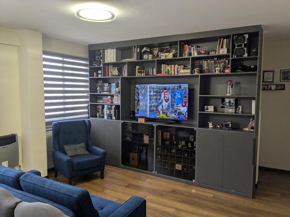Relájate en este moderno y acogedor departamento de 1 dormitorio, ubicado en Achumani, una de las zonas más lindas y tranquilas de La Paz. Frente a un hermoso parque y con una vista privilegiada de la ciudad. El departamento cuenta con 2 baños (uno principal y otro de visitas) y está equipado con domótica, incluyendo Alexa, para que tu estadía sea más cómoda. A pasos encontrarás supermercados, farmacias, cajeros, bancos, restaurantes y, cruzando la avenida, fácil acceso al transporte público.