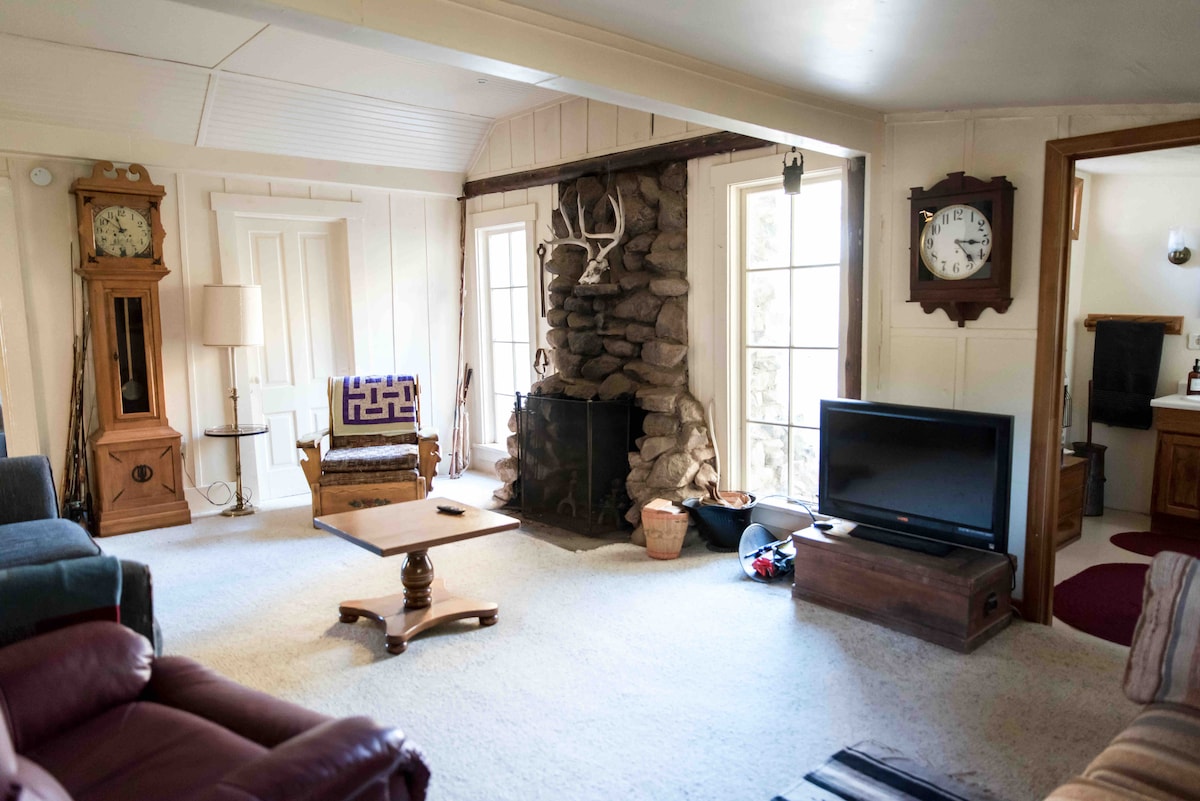 Ubicada entre los pinos sobre el centro de la ciudad, esta tranquila cabaña está diseñada para ayudarte a desconectar y relajarte. Observa a los ciervos dar su paseo matutino por la propiedad por sus propios caminos. Cierra los ojos y déjate llevar por los sonidos de los pájaros y el bosque que te rodea. En el interior encontrarás una encantadora combinación de moderno y vintage, un espacio recientemente renovado que es abierto, luminoso y muy limpio. Ten en cuenta que hay pendientes pronunciadas alrededor de la casa y que las barandillas del loft están demasiado separadas para ser seguras para los bebés.