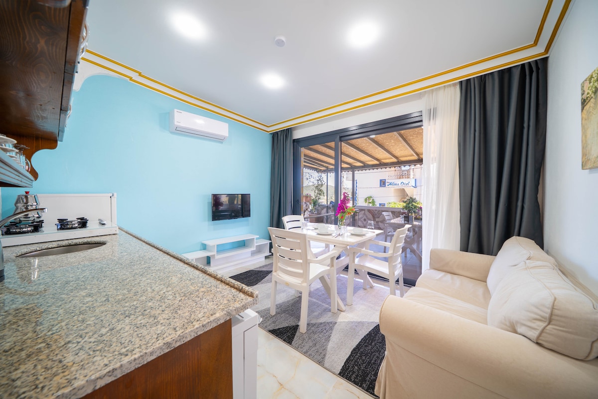 El apartamento🧿 Indigo ha sido preparado para ti como un hogar que puedes necesitar durante tu estancia de vacaciones. Nuestra casa es un apartamento estudio 1+0. Tenemos una gran terraza donde puedes pasar un rato agradable en el balcón y ver Setur Marina y la isla griega. ¡Mientras te balanceas en nuestro columpio con vistas al mar! ¡Disfruta de tu café recién hecho! Estamos ansiosos por recibirte. Mis mejores deseos 🌿 Se encuentra a 3-4 minutos en auto del centro.