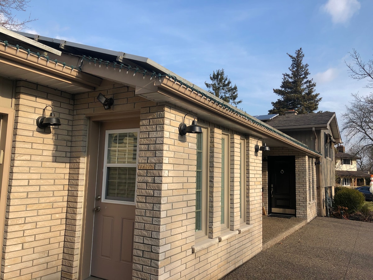 Te damos la bienvenida a nuestra acogedora suite secundaria con grandes ventanales y mucha luz natural. Nuestra suite recién renovada de 900 pies cuadrados es ideal para una familia o amigos que visitan Hamilton. El concepto abierto es ideal para alojarse o usarlo para fines nocturnos. Haz de tu estadía lo más cómoda y divertida de nuestra llamativa suite. Disfruta de restaurantes cercanos, cines, clubes de golf, zonas de conservación. No vemos la hora de darte la bienvenida. Estacionamiento gratuito en la calle justo enfrente de la casa en todo momento