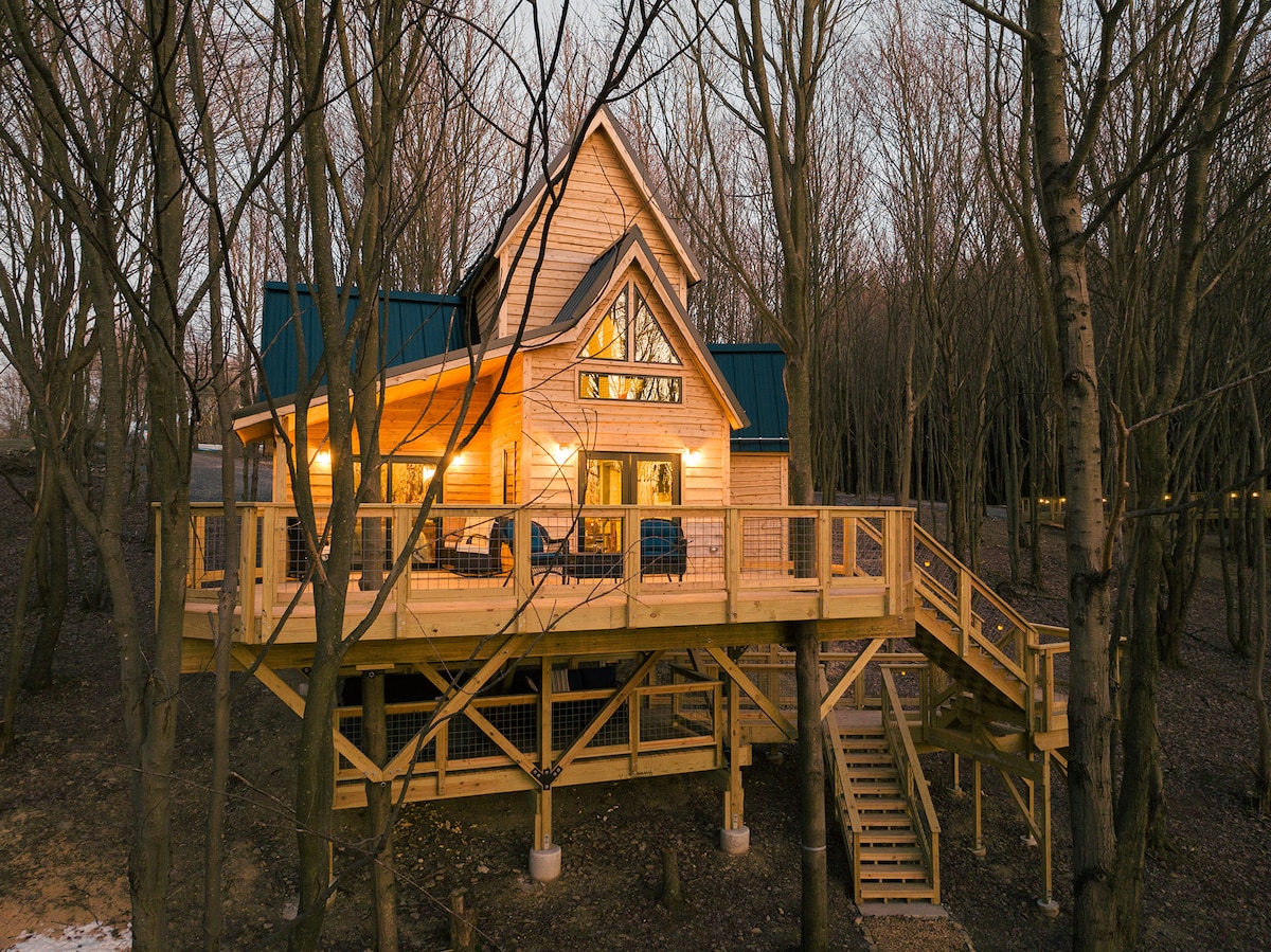 Ubicado en lo alto de las robustas ramas, «Bird's Eye View» es un santuario suspendido entre la tierra y el cielo. Ubicada a menos de 5 minutos del lago Deep Creek y encaramada entre el follaje, nuestra casa del árbol ofrece una perspectiva panorámica del bosque circundante, lo que otorga a sus visitantes un punto de vista incomparable para observar las maravillas de la naturaleza. Relájate en el jacuzzi y disfruta de una increíble puesta de sol. La casa es una mezcla armoniosa de arte y muebles de fabricación local para añadir encanto rústico y comodidad moderna.