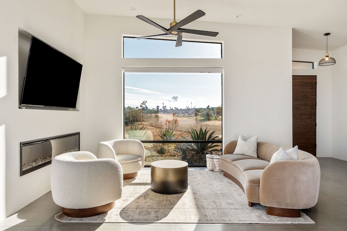 Sumérgete en esta lujosa casa de 3 dormitorios y 2 baños recién construida, con amplias ventanas que revelan los impresionantes paisajes, una piscina climatizada y un spa para disfrutar de baños bajo las estrellas, y un espacio dedicado al fitness. Relájate bajo cielos infinitos en 2 acres en tu propio oasis privado, perfecto para observar las estrellas y reunirse en el patio. Despiértate con impresionantes amaneceres, explora las maravillas de otro mundo de Joshua Tree y vuelve para darte un baño rejuvenecedor en tu refugio en el desierto.