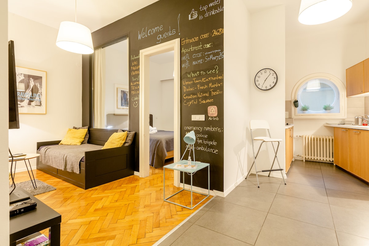 Nuestro pequeño estudio ubicado en el estricto centro de Zagreb está cerca de todo el escondite y sería un buen hogar para todos. La cocina está equipada con microondas y cafetera. Para tu comodidad, el estudio está equipado con televisión por cable, aire acondicionado y wifi gratuito. En el baño hay toallas limpias, artículos de tocador y secador de pelo. Estudio si moderno y acogedor. Todas las ubicaciones atractivas están a 10 minutos a pie.