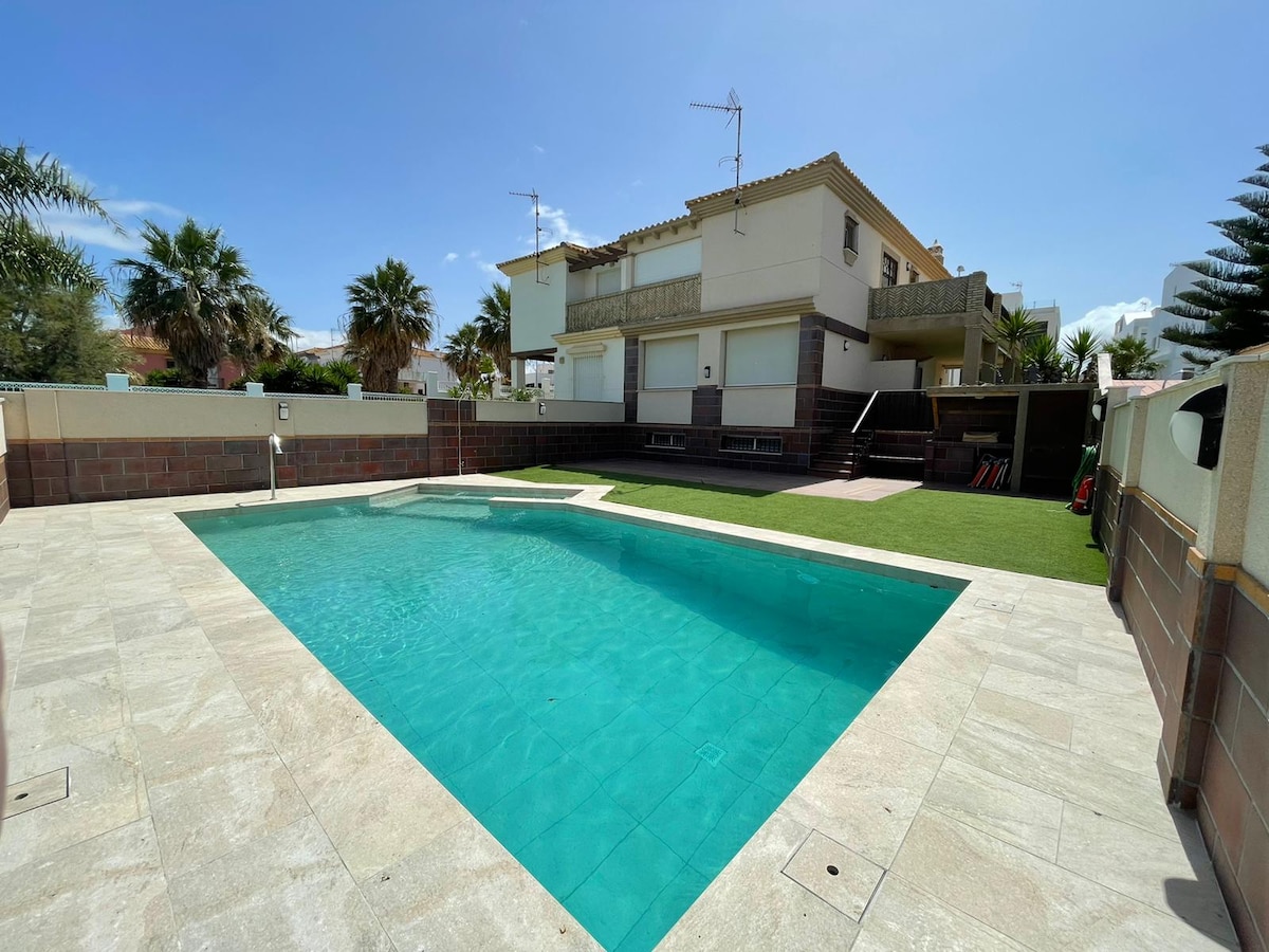Chalet en parcela de 500 metros, con el mejor césped artificial, distribuida en porche de acceso a vivienda acristalada, salón, cocina completa, tres baños completos, uno de ellos en el exterior, salón con puerta de seguridad al jardín, tres dormitorios, el principal con baño interior. Aire acondicionado en toda la casa. En la zona de la piscina privada, hay cocina exterior con comedor y barbacoa de carbón y fuego de gas, totalmente completa. La casa consta de wifi, sabanas y toallas.