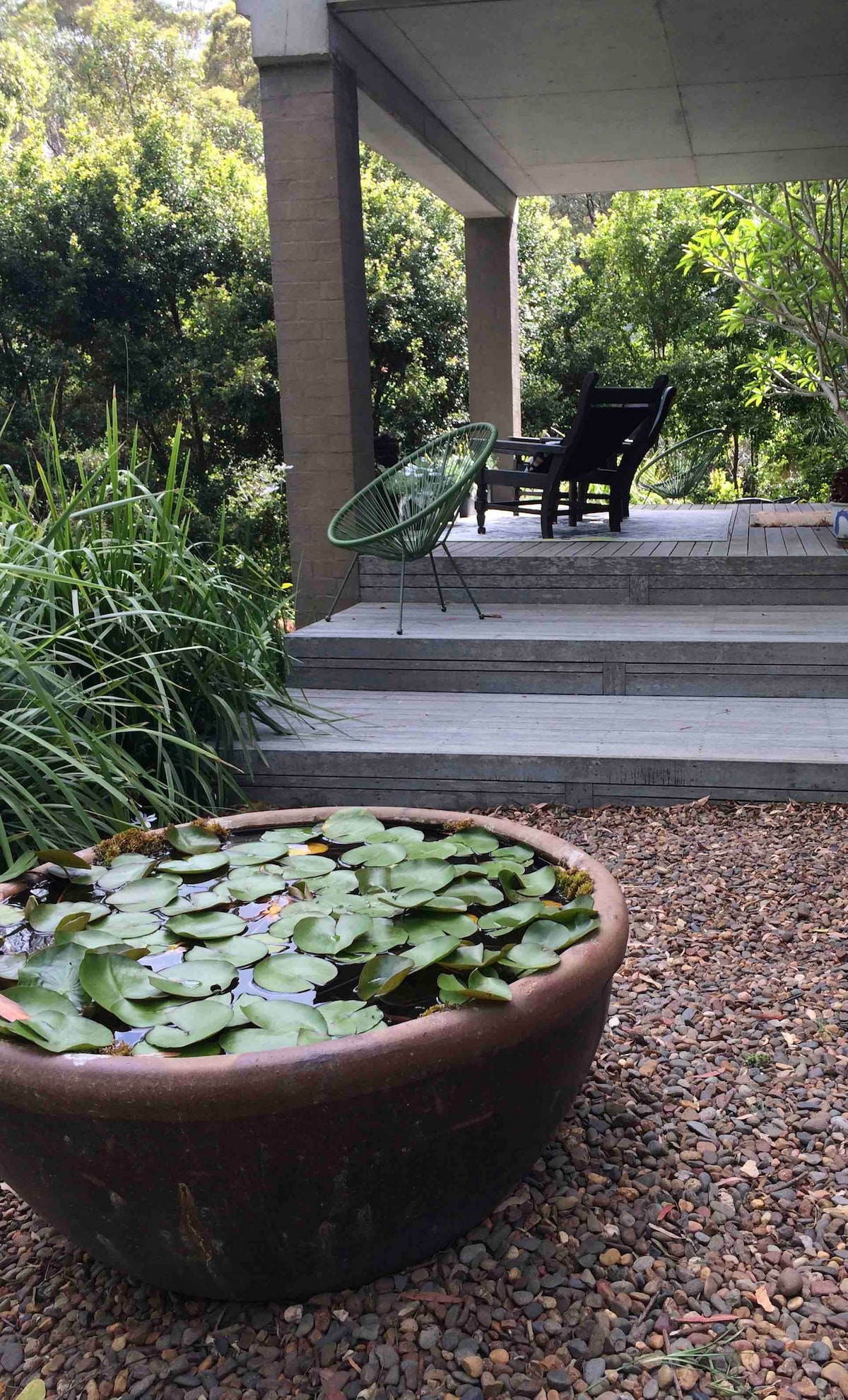 Relájate en tu propio oasis romántico con un dormitorio tamaño queen, baño privado con bañera independiente y ducha, un estudio/estudio separado con área de trabajo y una cocina pequeña y lavandería. Relájate con comodidad en la amplia sala de estar que se abre a una gran terraza soleada con vistas al exuberante jardín nativo. Todo está provisto para tu comodidad, incluido un ligero desayuno continental, café, té y refrigerios, batas mullidas, ropa de cama de alta calidad, sábanas y toallas. Se proporcionan sillas de playa, sombrilla y toallas.