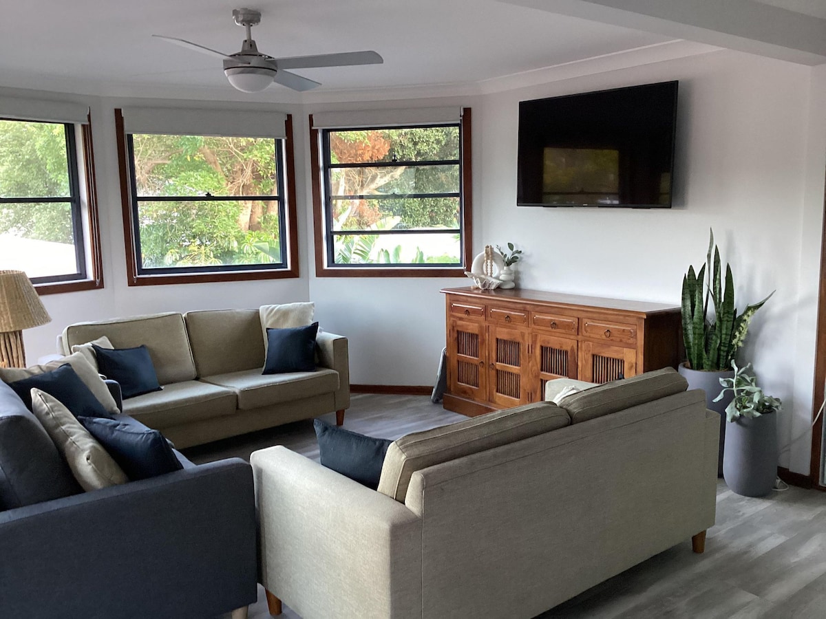 Escapada única para dos. ¡Experimenta la comodidad moderna en uno de los destinos más buscados de Nueva Gales del Sur para ese fin de semana perfecto o descanso a mitad de semana! Nuestra casa de huéspedes con aire acondicionado está separada de la casa principal, lo que te da privacidad y espacio. Tendrás acceso a nuestra espaciosa zona al aire libre con barbacoa y comedor exterior. Simplemente relájate junto a la piscina, lee un libro en el patio trasero privado o pasa tus días en la playa o explorando. Tenemos 2 tablas de boogie y flotadores de piscina que puedes utilizar durante tu