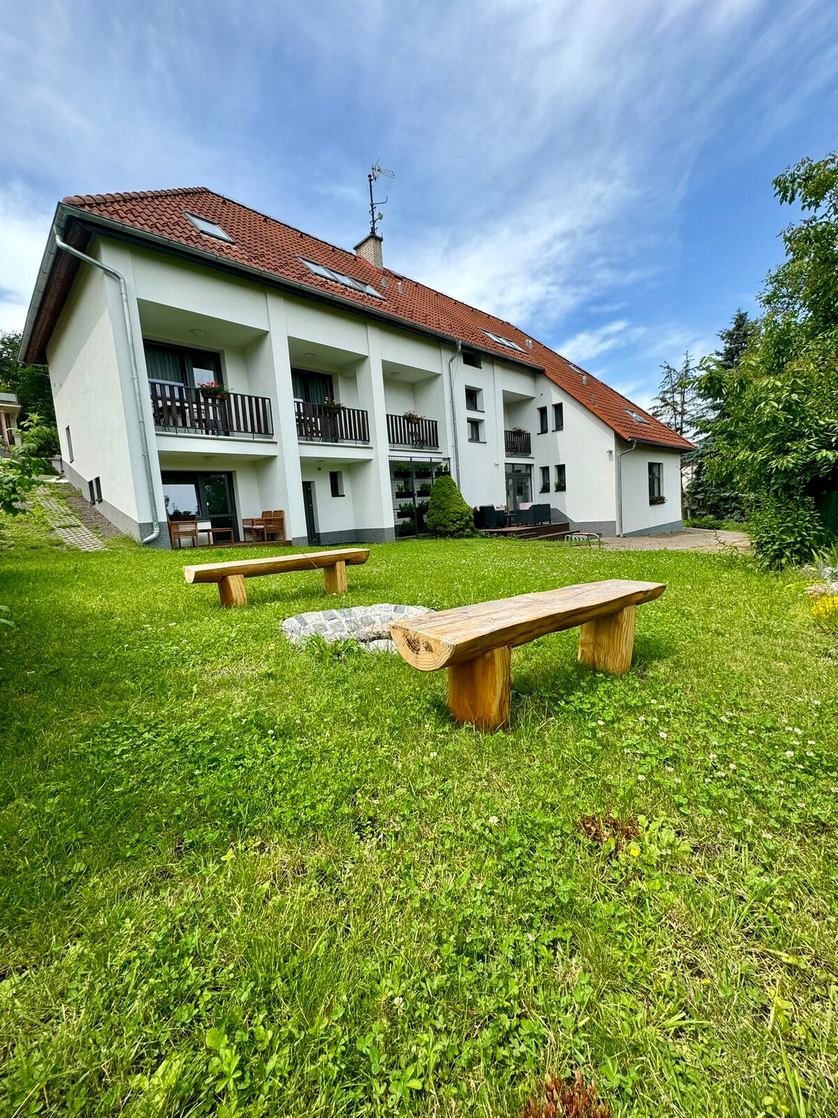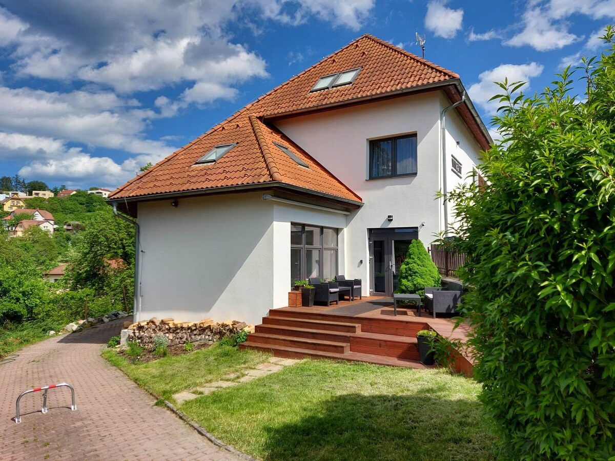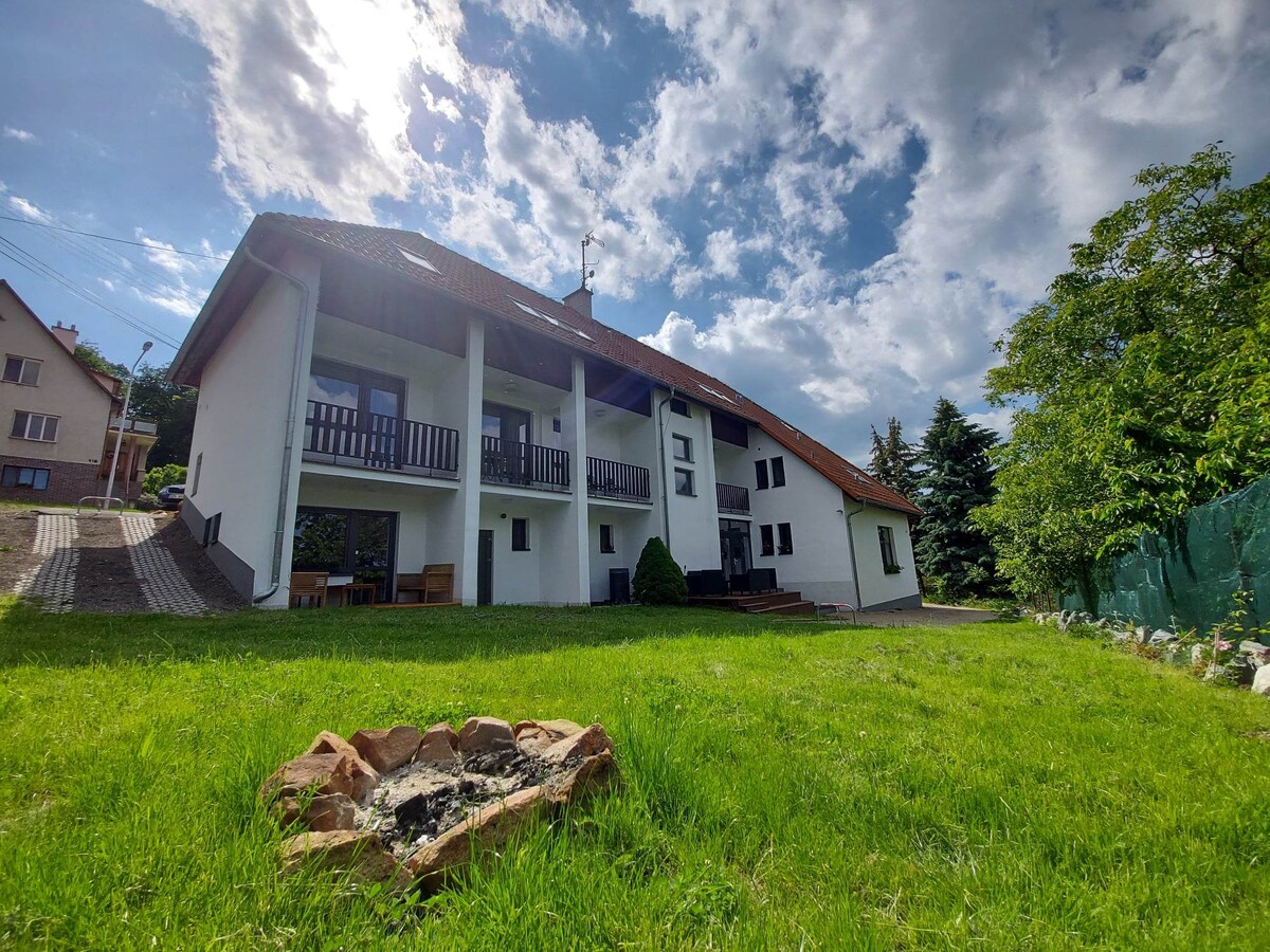 Esta espaciosa casa de hotel en Zlín es ideal para alquileres de corta duración (a largo plazo por acuerdo), adecuada para grupos y familias. Ofrece 3 apartamentos, cada uno con habitaciones con cerradura, cocina, baño e inodoro. - ubicación tranquila cerca del centro y de la naturaleza. - Alojamiento para grupos y familias. - departamentos con cocina propia, baño e inodoro. - Para 2-5 personas / habitación. - Wifi, lavadora, nevera, estufa, microondas. - Ideal para relajarse y viajar a los alrededores.