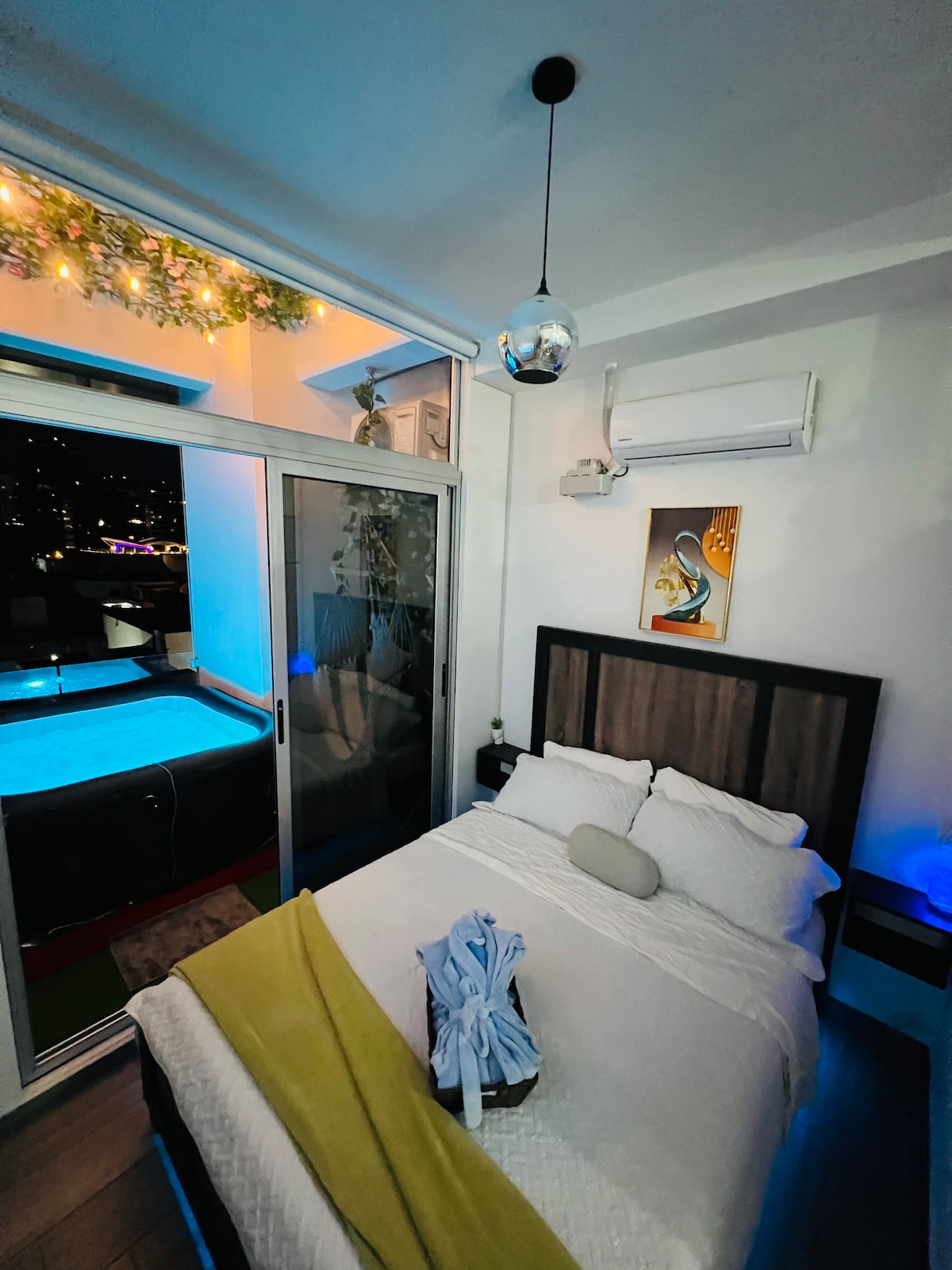 Relájate en este espacio tan tranquilo y elegante. Disfruta de una experiencia con estilo en este alojamiento en la mejor area de la ciudad, a pocos metros del aeropuerto. Con un balcon con jacuzzi y chimenea, nuestra suite de lujo tiene una vista impresionante a la ciudad. Es una muy buena opcion para ti para quedarte, tiene un estilo moderno, area para home office, nunca te aburriras mientras trabajas, conocelo!!