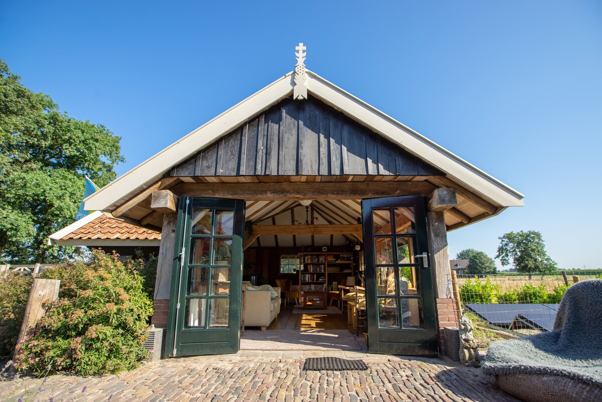 Una casa de huéspedes de estilo rústico construida en 2017 en el lugar de un antiguo granero. Ampliamente situado en las afueras, a quince minutos de Zwolle. Disfruta de la luz, el aire, el espacio, la tranquilidad y el hermoso cielo estrellado. Equipado con dos baños, una sauna finlandesa, una cocina completa, calefacción central, chimenea de gas, buenas camas, terrazas con sillas de salón, barbacoa y chimenea y todo lo que se puede esperar en un alojamiento de lujo.